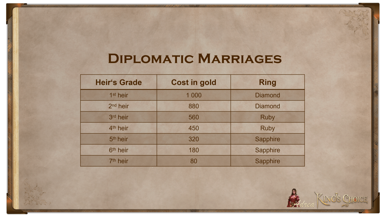 - Once the heir reaches the max level, he/she is eligible for marriage. The heir can be married only to other players' heirs, heirs of one player cannot marry each other. Once the marriage between heirs is confirmed, the players earn their heir's partner's attributes, increasing their state power. The heirs can be married off only to heirs of the same rank/title/grade (e.g., 4th rank princess with 4th rank prince).